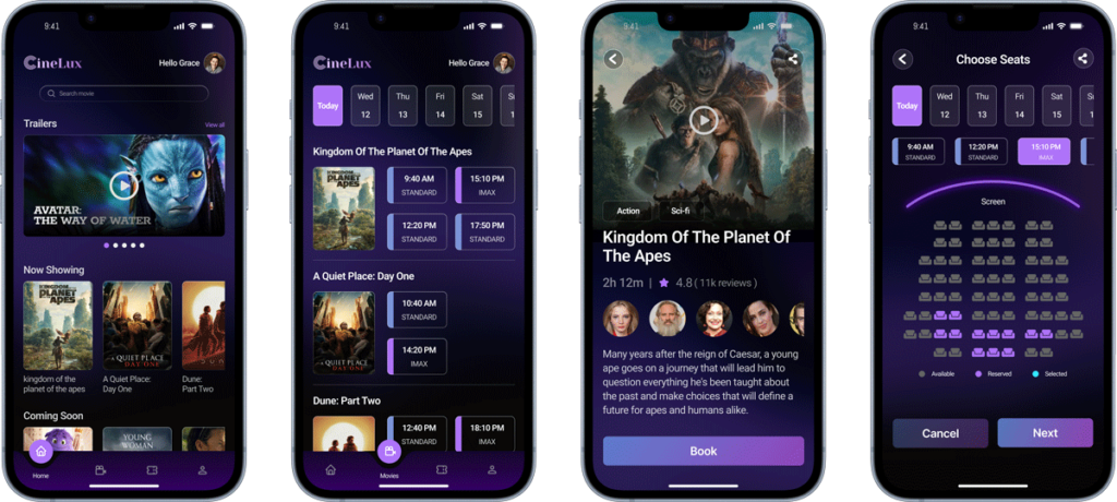 This was a personal UX/UI design project, independently created as part of my portfolio development. The project aims to design a modern and engaging movie application that allows users to book tickets and explore currently screening and upcoming films.